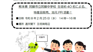 イベント情報 2026/2/25(水)熊本県阿蘇市立阿蘇中学校生徒約40 名による、特産品販売、地元PR 活動が行われます! 中学生による商人体験のお知らせダウンロード 2026.01.31 イベント情報